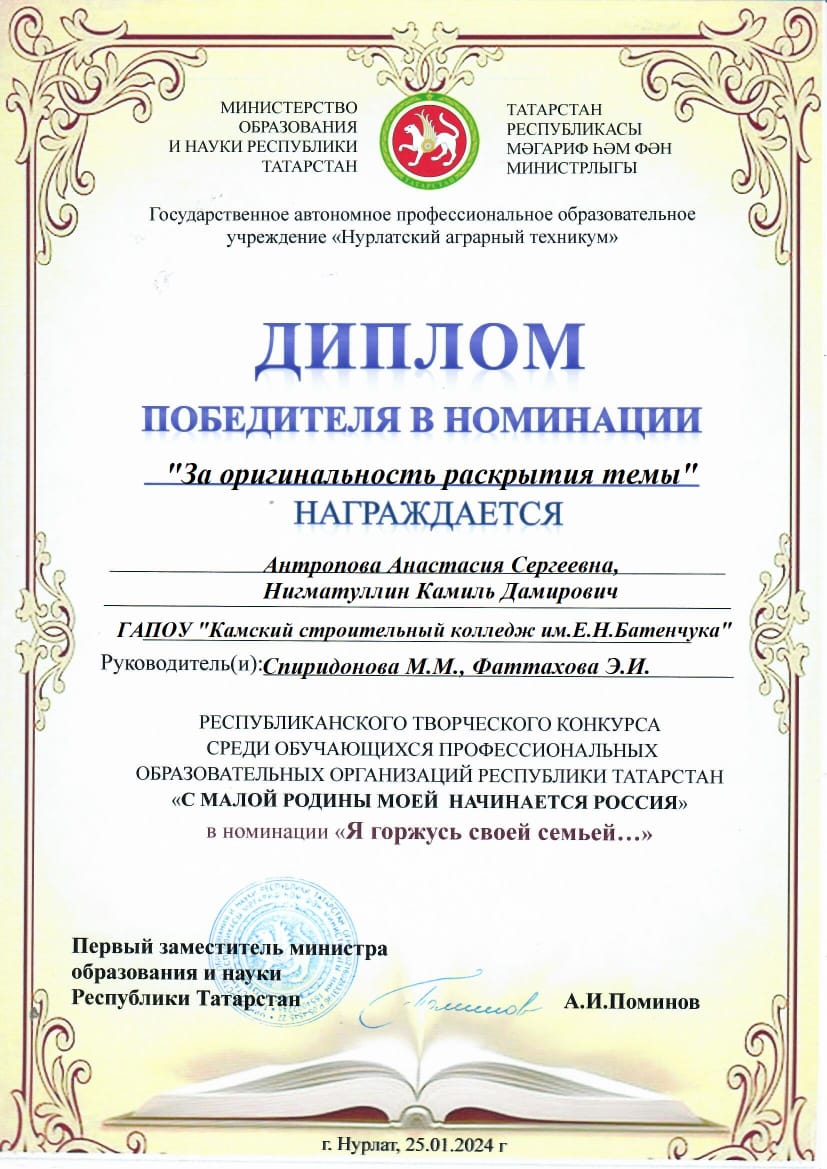 25 января стали известны результаты республиканского творческого конкурса среди обучающихся ПОО Республики Татарстан «С малой Родины моей начинается Россия».