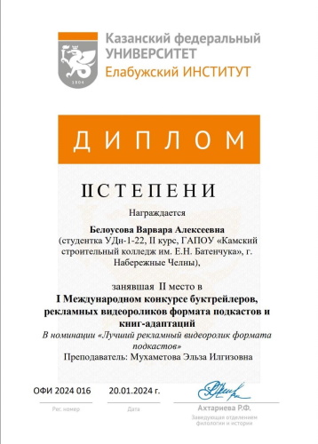 Студентка группы УДн-1-22 Белоусова Варвара Алексеевна приняла участие и заняла призовое место в номинации «Лучший рекламный видеоролик формата подкастов». Руководитель – Мухаметова Эльза Илгизовна.