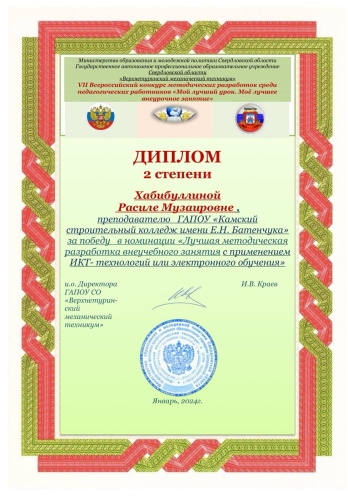 Преподаватель нашего колледжа Хабибуллина Расиля Музаировна приняла участие в VII Всероссийском конкурсе методических разработок среди педагогических работников «Мой лучший урок. Моё лучшее внеурочное занятие» и заняла призовое место в номинации «Лучшая методическая разработка внеучебного занятия с применением ИКТ-технологий или электронного обучения».