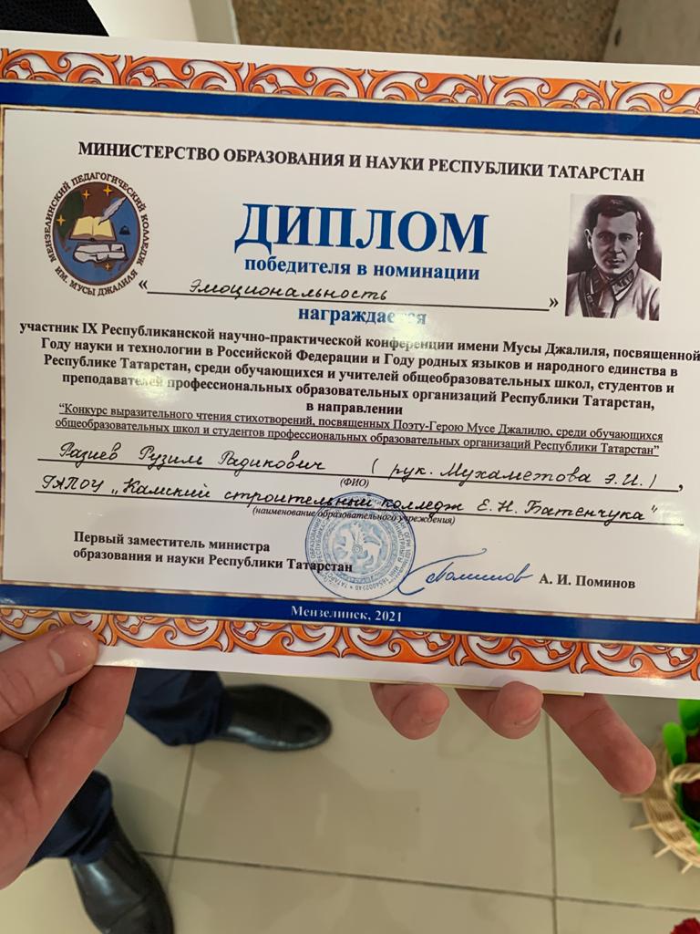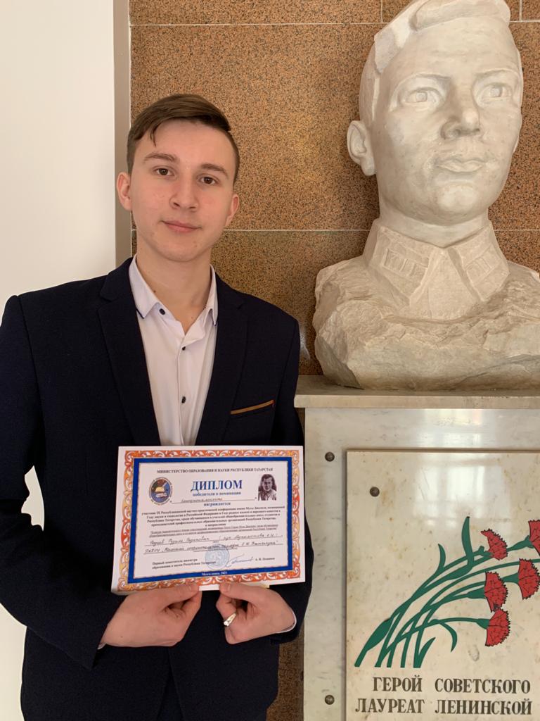 Опубликовано: 18.02.202115 февраля 2021 года исполнилось 115 лет со дня рождения татарского поэта-героя Мусы Джалиля. Студент нашего колледжа Разиев Рузиль Радикович, под руководством преподавателя Мухаметовой Эльзы Ильгизовны, стал победителем в номинации «Эмоциональность» в IX Республиканской научно-практической конференции имени Мусы Джалиля, посвященной Году науки и технологии в Российской Федерациии, Году родных языков и народного единства в Республики Татарстан, среди обучающихся и учителей общеобразовательных школ, студентов и преподавателей профессиональных образовательных организаций Республики Татарстан. Это ваша заслуженная награда, ради которой было потрачено множество сил, терпения и трудов. Пусть в дальнейшем, Вас ждут еще большие победы и настоящие свершения. И пусть этот успех, никогда не даст остановиться на достигнутом!