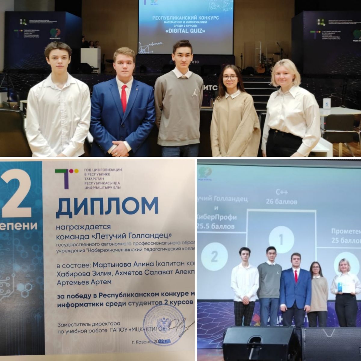 ПОЗДРАВЛЯЕМ ПРИЗЕРОВ РЕСПУБЛИКАНСКОГО КОНКУРСА!С целью развития познавательного интереса к изучению математики и информатики у обучающихся ПОО 30 ноября 2022 года на базе ГАПОУ «Международный центр компетенций – Казанский техникум информационных технологий и связи» прошел финал Республиканского конкурса по математике и информатике среди студентов 2 курсов «Digital quiz».