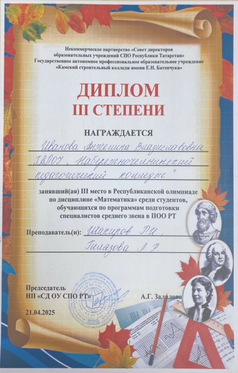 21 апреля 2025 года на базе ГАПОУ «Камский строительный колледж имени Е.Н. Батенчука» состоялась республиканская олимпиада по дисциплине «Математика».