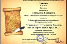 Поздравляем Трепалину Екатерину, студентку группы Д-162, с дипломов I степени в 2-ом Всероссийском конкурсе, посвященному дню поэзии «Таков поэт: чуть мысль блеснет, как он пером своим блеснет…». Конкурс проводил Всероссийский центр гражданских и молодежных инициатив «Идея» города Оренбурга.