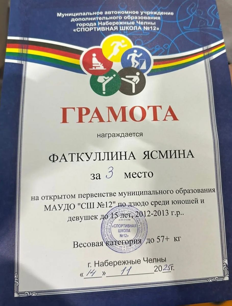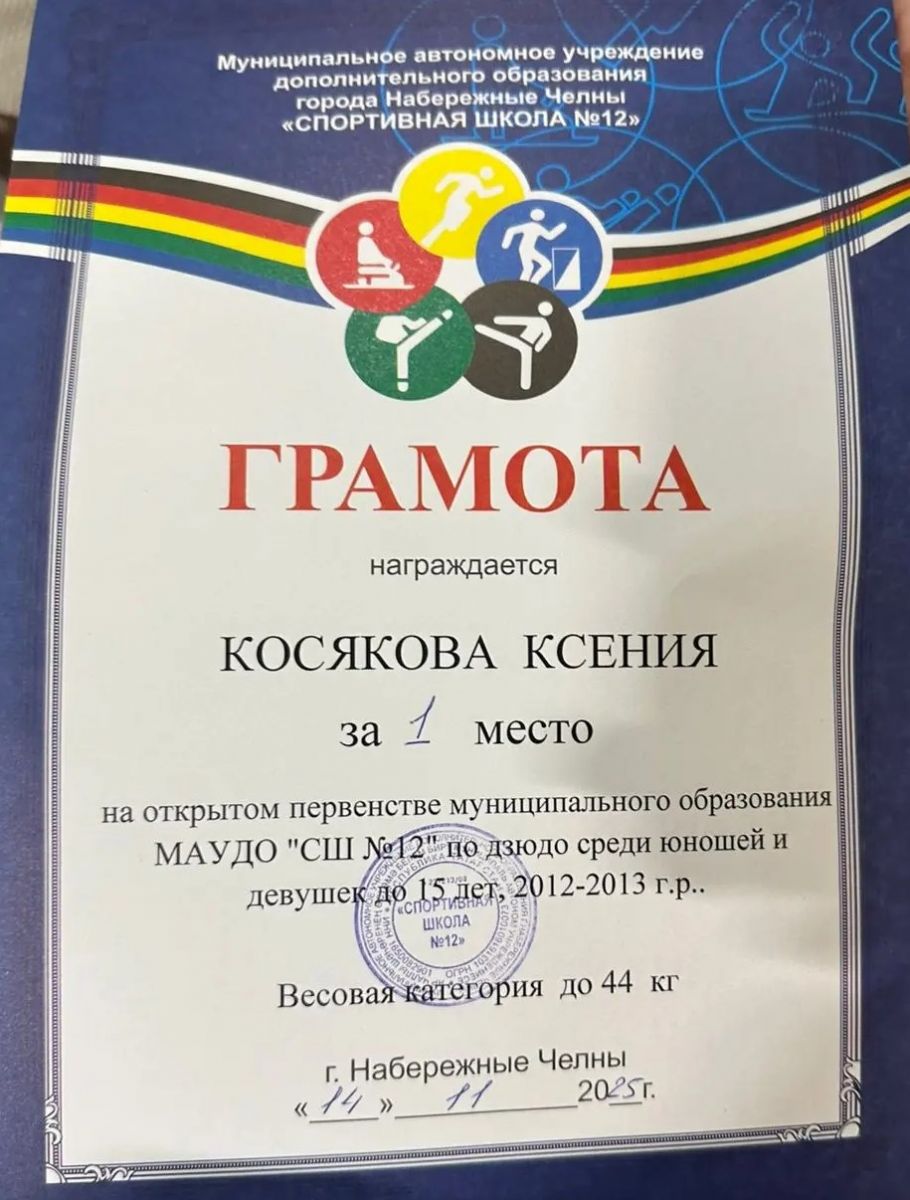 - Косякова Ксения 1 место, Фаткуллина Ясмина 3 место в Открытом первенстве муниципального образования МАУДО " СШ №12" по дзюдо среди юношей и девушек до 15 лет, 2012-2013 г.р (13-14.11.2025)
