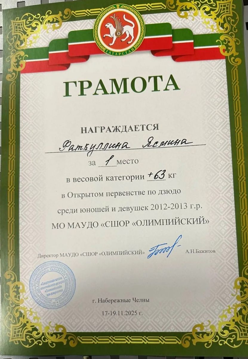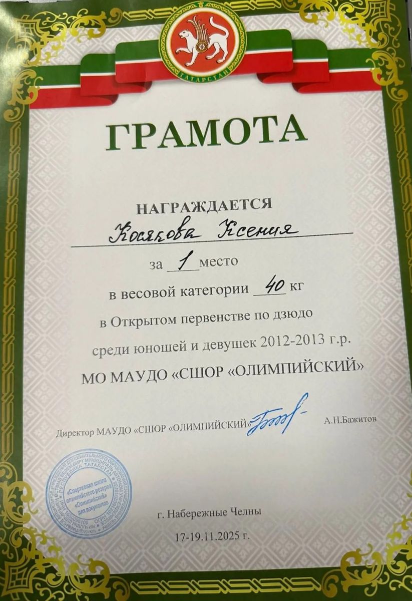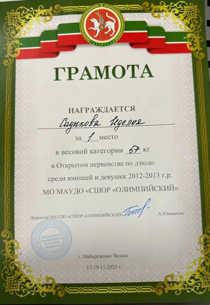 - Косякова Ксения 1 место, Садыкова Иделия 1 место, Фаткуллина Ясмина 1 место в Открытом первенстве по дзюдо среди юношей и девушек МАУДО "СШОР "Олимпийский" (17-19.11.2025)