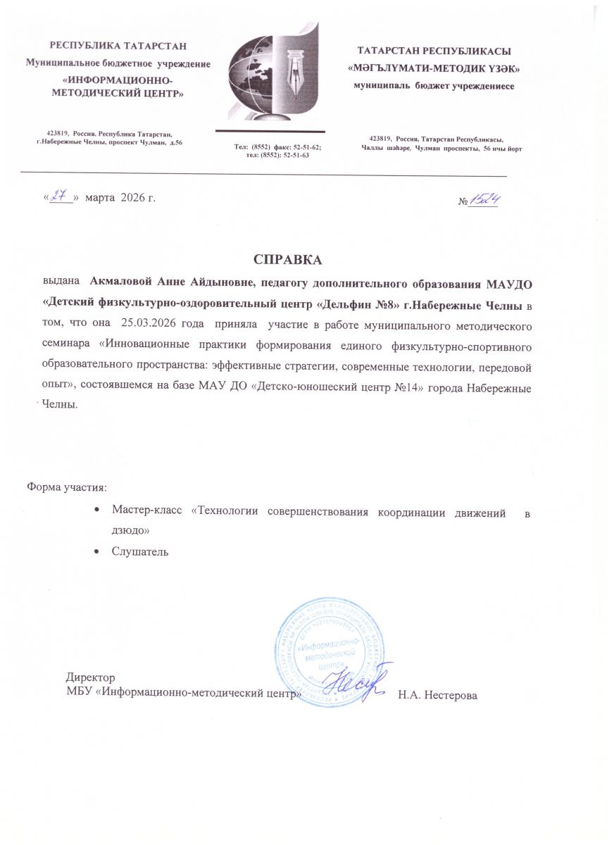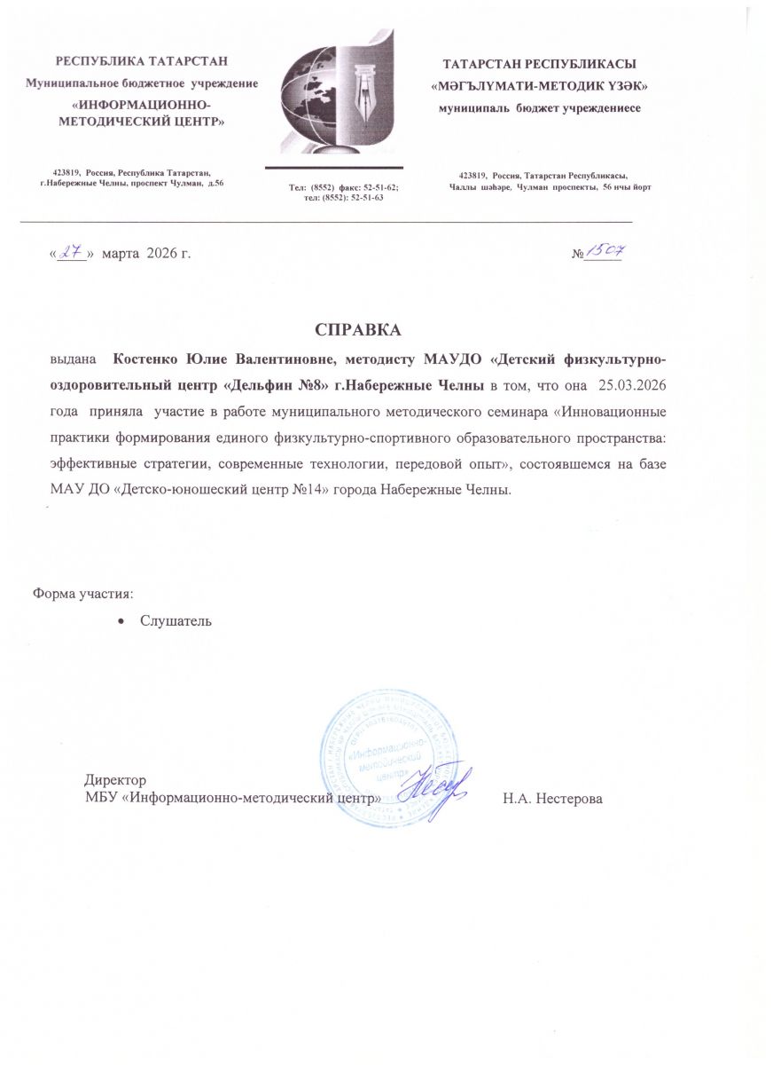 Ильина Г.Ф., Костенко Ю.В., Миниханова С.А., Акмалова А.А., Валинуров Р.Р., - приняли участие в муниципальном методическом семинаре «Инновационные практики формирования единого физкультурно-спортивного образовательного пространства: эффективные стратегии, современные технологии, передовой опыт» (25.03.2026)