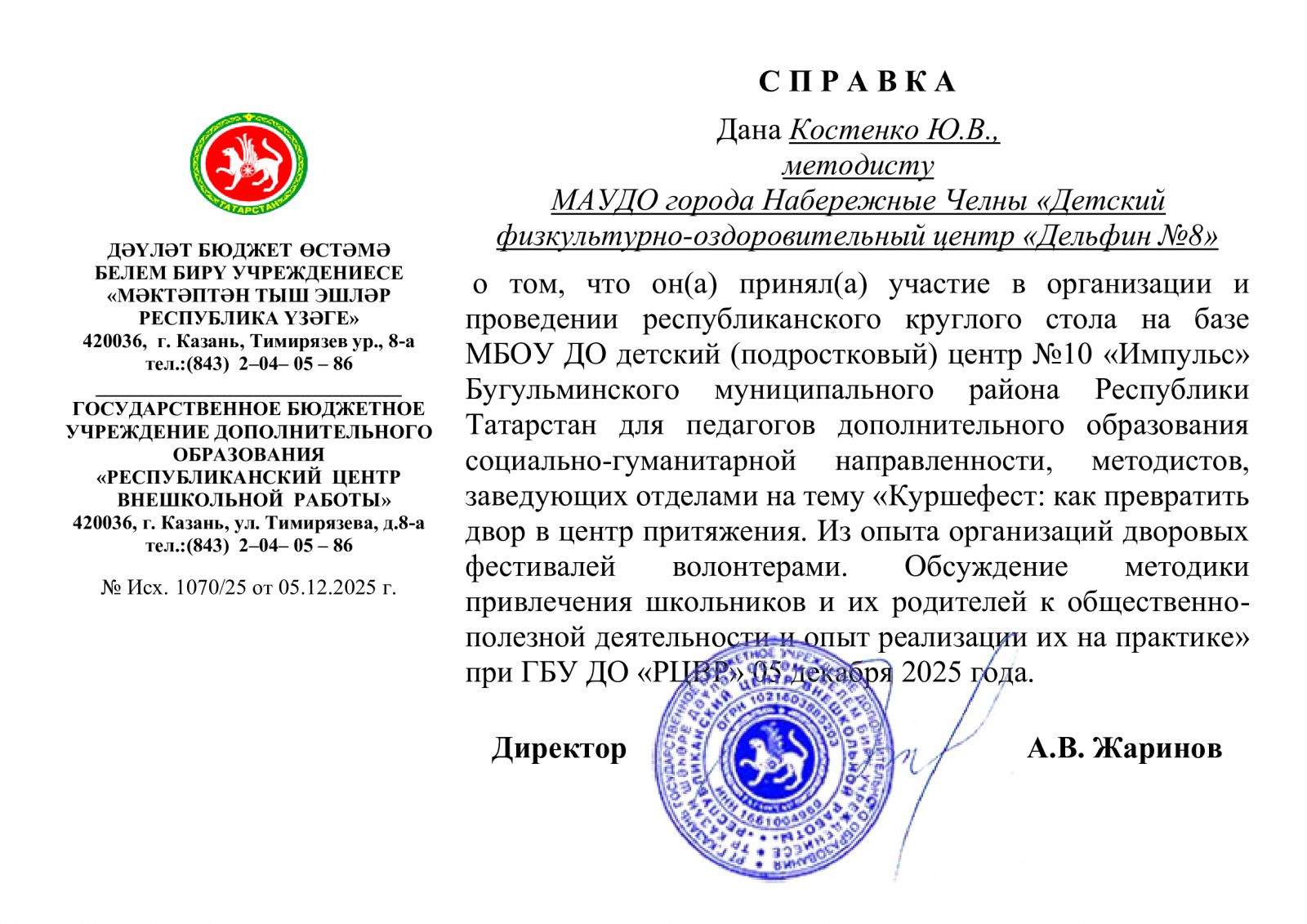 - Ильина Г.Ф., Цыганов И.В.,Костенко Ю.В. - приняли участие в организации и проведении республиканского круглого стола "Куршефест".Тема круглого стола: как превратить двор в центр притяжения. Из опыта организации дворовых фестивалей волонтерами. Обсуждение методики привлечения школьников и их родителей к общественно-полезной деятельности, а также опыт её реализации на практике." (дистанционно, 5 декабря 2025 года),