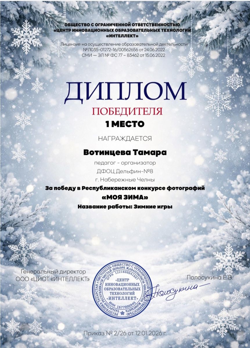 - Вотинцева Т.В. - 1 место в Республиканском конкурсе фотографий "Моя зима" (Приказ №2/26 от 12.01.2026 г.)