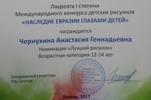 Поздравляем Чернухину Анастасию Геннадьевну с I местом в Международном конкурсе детских рисунков «НАСЛЕДИЕ ЕВРАЗИИ ГЛАЗАМИ ДЕТЕЙ» и получением сертификата на сумму 4000 рублей. Так держать!