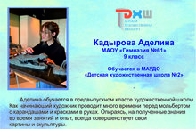В гимназии № 61 открылась персональная выставка ученицы 9 класса Кадыровой Аделины. Аделина обучается в предвыпускном классе Детской художественной школы №2. Как начинающий художник проводит много времени перед мольбертом с карандашами и красками в руках. Опираясь на полученные знания во время занятий и опыт, всегда совершенствует свои картины и скульптуры. Является многократной победительницей в творческих конкурсах разного уровня. Прошла обучение по образовательной программе "Основы анималистической скульптуры" в образовательном центре "Сириус" г. Сочи, 2020 г.