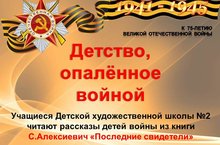 К 75-летию Победы в Великой Отечественной войне библиотекарь Исмаилова Л.И. и учащиеся ДХШ №2 подготовили мероприятие “Детство, опалённое войной". Учащиеся читают рассказы-воспоминания людей, детство которых выпало на время войны, кого война лишила детства. Воспоминания о Великой Отечественной тех, кому в войну было от трёх до 12 лет – самых беспристрастных и самых несчастных её свидетелей. Здесь малая толика того, что собрано в книге С.Алексиевич "Последние свидетели. Соло для детского голоса"