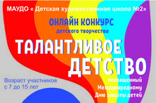 1 июня 2020 г. МАУДО « Детская художественная школа №2» объявляет онлайн конкурс детского творчества «Талантливое детство», посвященный Международному Дню защиты детей.Приглашаем к участию и желаем творческого вдохновения!!!