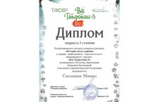 Учащийся Детской художественной школы №2 Смоленков Михаил, преподаватель Зыбина Н.Н., был награжден в торжественной обстановке в г. Казань Дипломом лауреата I степени Республиканского конкурса рисунков «История моего района» в рамках национального образовательного анимационного проекта «Век Татарстана-3», посвященного 100-летию образования ТАССР. Поздравляем Михаила и желаем ему дальнейших творческих побед!!! -