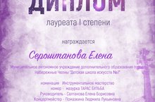 Сероштанова Елена стала Лауреатом I степени в номинации «Струнно-смычковые инструменты»! Поздравляем преподавателя Салтанову Елену Борисовну и концертмейстера Помазкину Людмилу Лукьяновну!