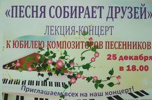 25.12.2018 в 18.00 на базе СОШ №4 состоялась лекция-концерт «Песня собирает друзей» к юбилею композиторов песенников в рамках Школьного лектория «В мире искусства. Юбилейные даты 2018-2019». -