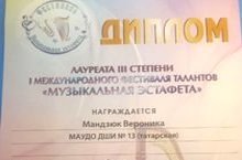 Новый учебный год стартовал совсем недавно, а у нас уже есть лауреат I международного фестиваля талантов "Музыкальная эстафета", проведенного в г. Москва - Мандзюк Вероника (преподаватель Медведева Л.М.). Поздравляем с победой, желаем дальнейших творческих успехов !!!