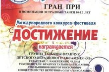 7 - 9 января 2017 года в Казани прошел Международный конкурс-фестиваль "Достижение". Поздравляем Группу Татьяны Франчук Образцового детского коллектива хореографического ансамбля "Яз" с победой. Под руководством преподавателей Татьяны Николаевны Франчук и Виктора Викторовича Смольянинова ребята завоевали Гран-При фестиваля.