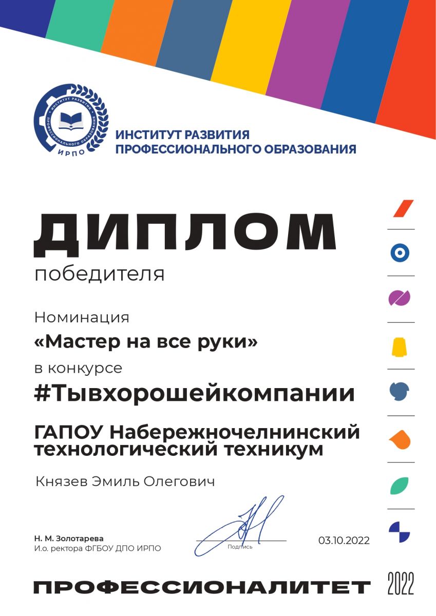 Опубликовано: 05.10.2022Председатель студенческого совета Князев Эмиль, совместно с педагогом-организатором Камаловым А.И., в рамках празднования Дня среднего профессионального образования, приняли участие во Всероссийском конкурсе студенческих роликов «#Тывхорошейкомпании” в номинации «Мастер на все руки» и одержали победу! Поздравляем и желаем не останавливаться на достигнутом!