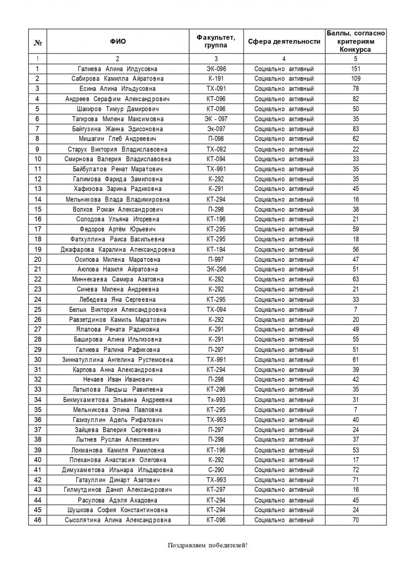 Опубликовано: 14.12.2022Список победителей Набережночелнинского технологического техникума в конкурсе по отбору получателей финансовой поддержки среди обучающихся очной формы обучения профессиональных образовательных организаций и образовательных организаций высшего образования, расположенных на территории Республики Татарстан, наиболее активно проявивших себя в научно-исследовательской, общественной, культурно-творческой или спортивной деятельности,