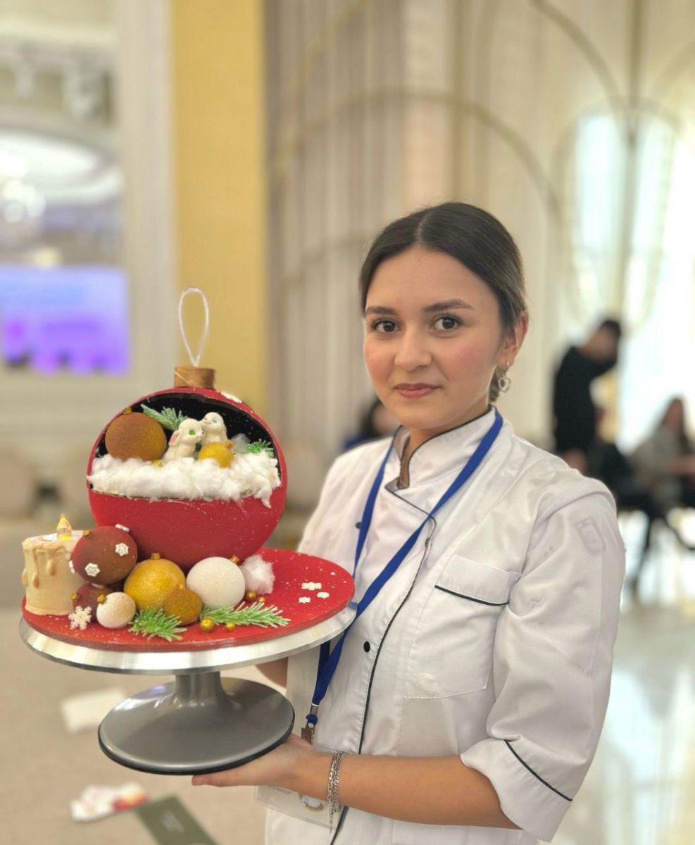 Студентка 3 курса по специальности 43.02.15 Поварское и кондитерское дело Ялалова Рената ( К-291) представила на суд жюри торт в форме ёлочной игрушки шара из шоколада, внутри которого находится различные слои