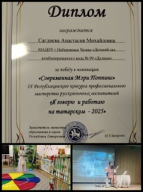 Опубликовано: 08.12.2025Наш талантливый педагог-психолог - Анастасия Михайлова, участвовала в IX Республиканском конкурсе профессионального мастерства русскоязычных воспитателей "Я говорю и работаю на татарском - 2025" и получила заслуженный диплом в номинации "Современная Мэри Поппинс". Конкурс прошел в городе Арск, где собрались 15 лучших педагогов Татарстана. Анастасия Михайловна продемонстрировала высокий уровень владения языком, методическое мастерство и способность вдохновлять детей и коллег.