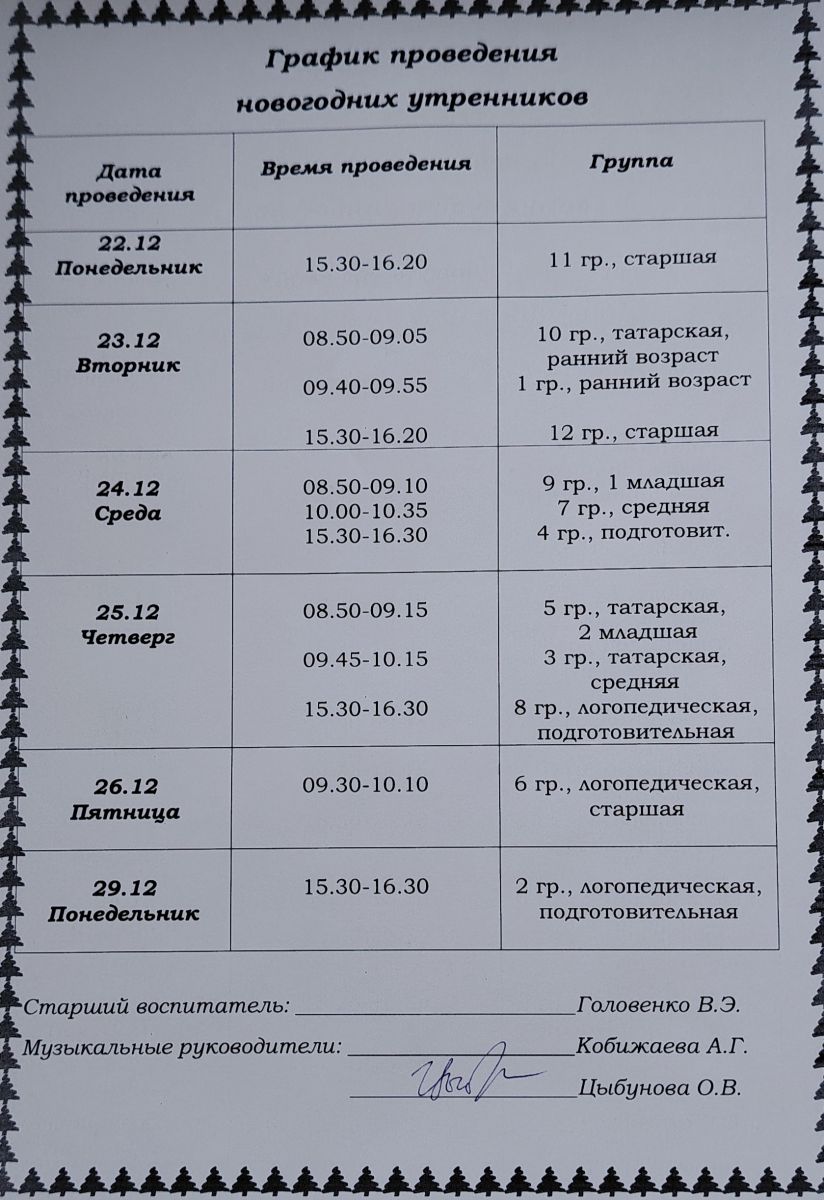 График проведения новогодних утренников