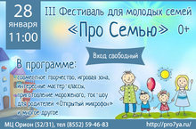 28 января в 11.00 в Молодёжном центре "Орион" пройдёт III фестиваль для молодых семей "Про Семью". Вход свободный. С програмой вы можете ознакомиться по ссылке.