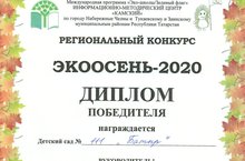 Среди дошкольных образовательных учреждений по городу Набережные Челны и Тукаевскому и Заинскому муниципальным районам Республики Татарстан по Международной программе "Эко-школы/Зелёный флаг" состоялся региональный конкурс "ЭКООСЕНЬ-2020". Наш детский сад стал лидером и удостоился диплома победителя!