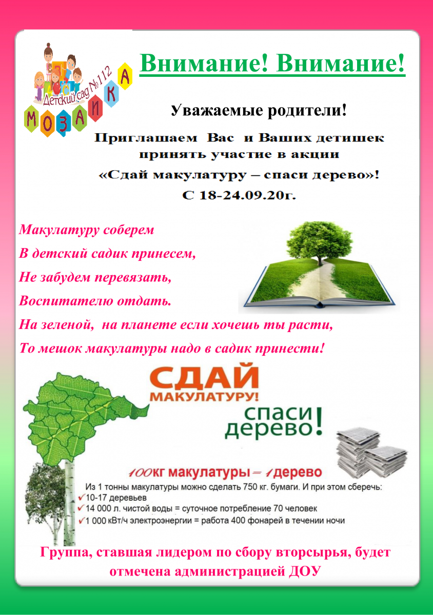 С 18 по 24 сентября пройдет сбор макулатуры. Просим принять активное участие.