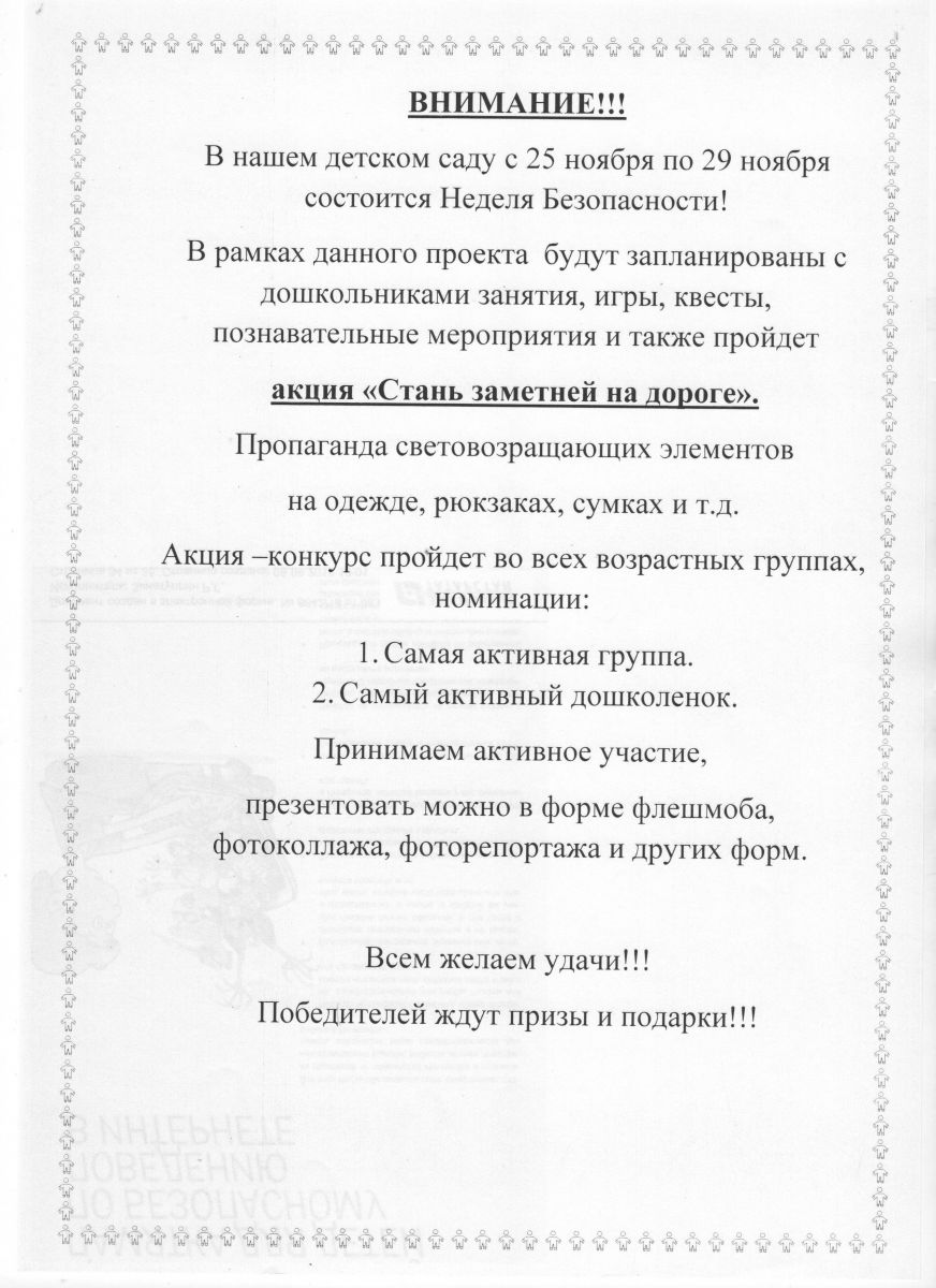 С 26 ноября в саду стартовала акция "стань заментей на дороге", где все возрастные группы приняли активное участие. Подготовительные группы показали номер агидбригады "Доржная мозаика", старшие группы видео с флешмобом, остальные группы фотоотчет (Общее фото, индивидуальное фото).