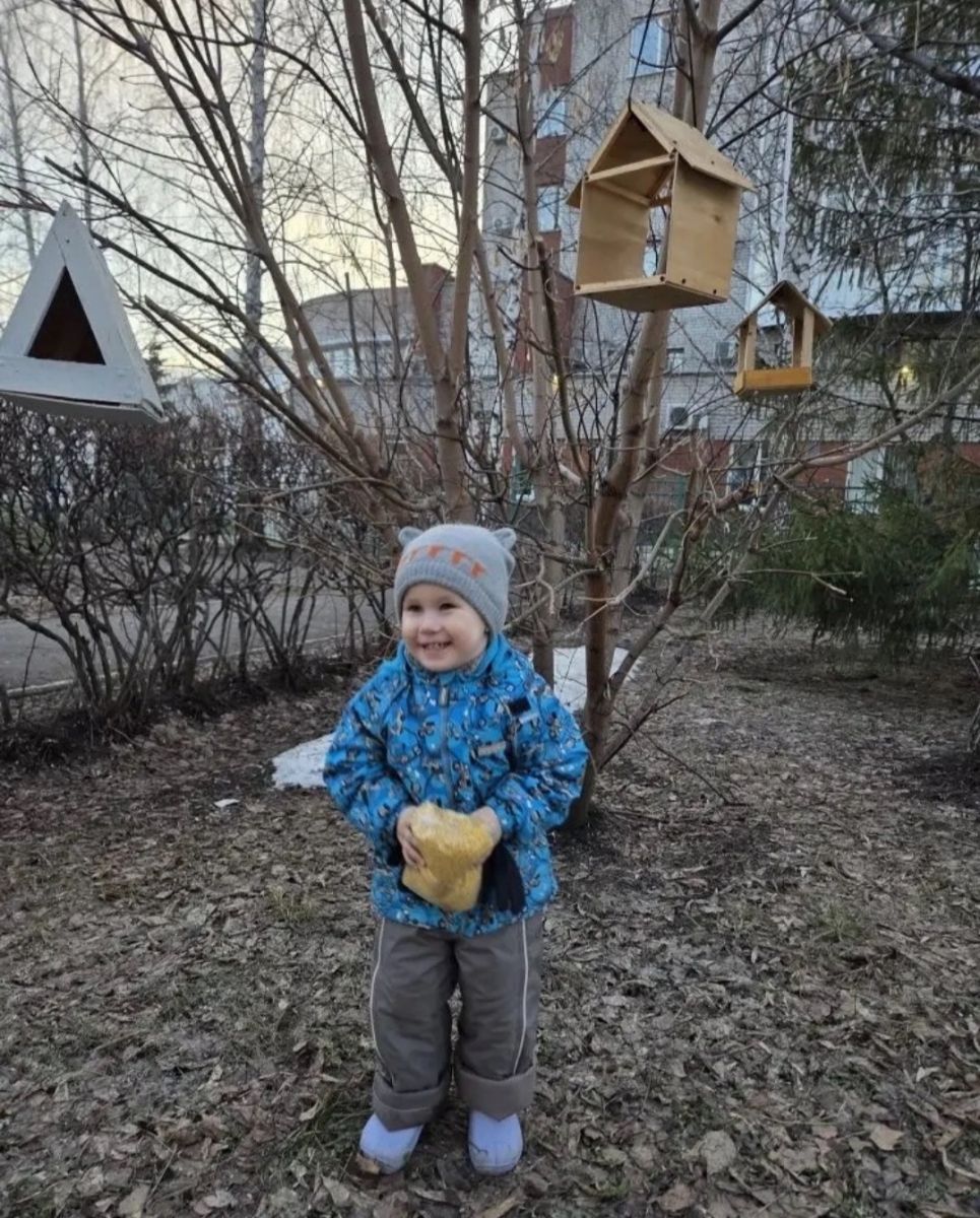 Вместе с мамой и папой решили позаботиться о птицах. Семья отправилась на прогулку неподалёку от дома и вывесила несколько ярких кормушек на деревьях. В эти уютные домики они насыпали вкусные угощения: семечки подсолнуха, крошки хлеба, сушёный горох и кусочки несолёного сала.