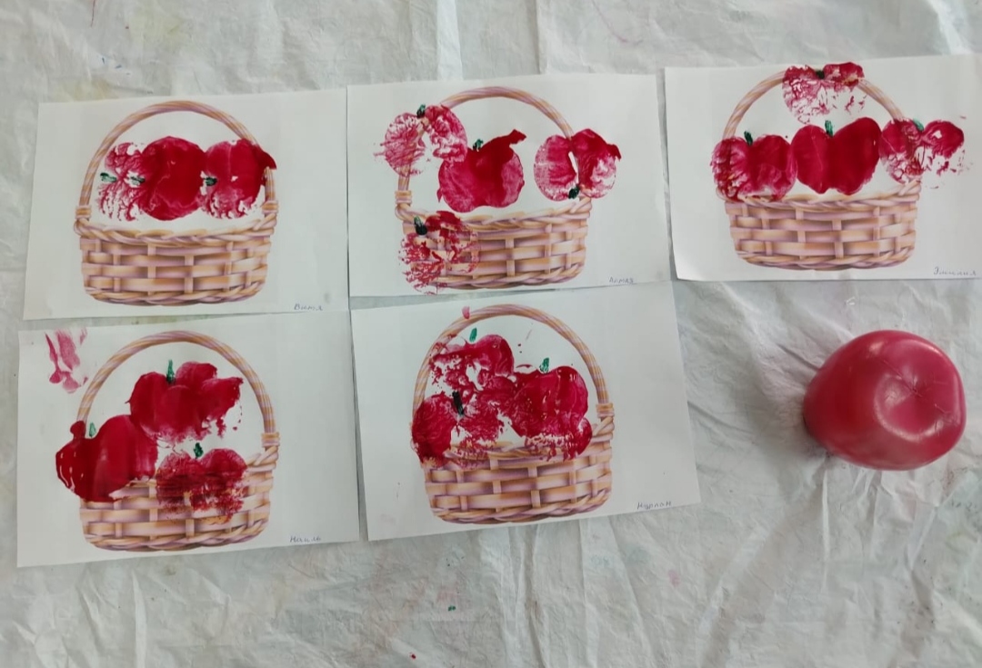Воспитанники группы 2 решили собрать яблоки в корзину. В этом им помогли наливные яблочки. Ребята с интересом изучали новую нетрадиционную технику рисования.