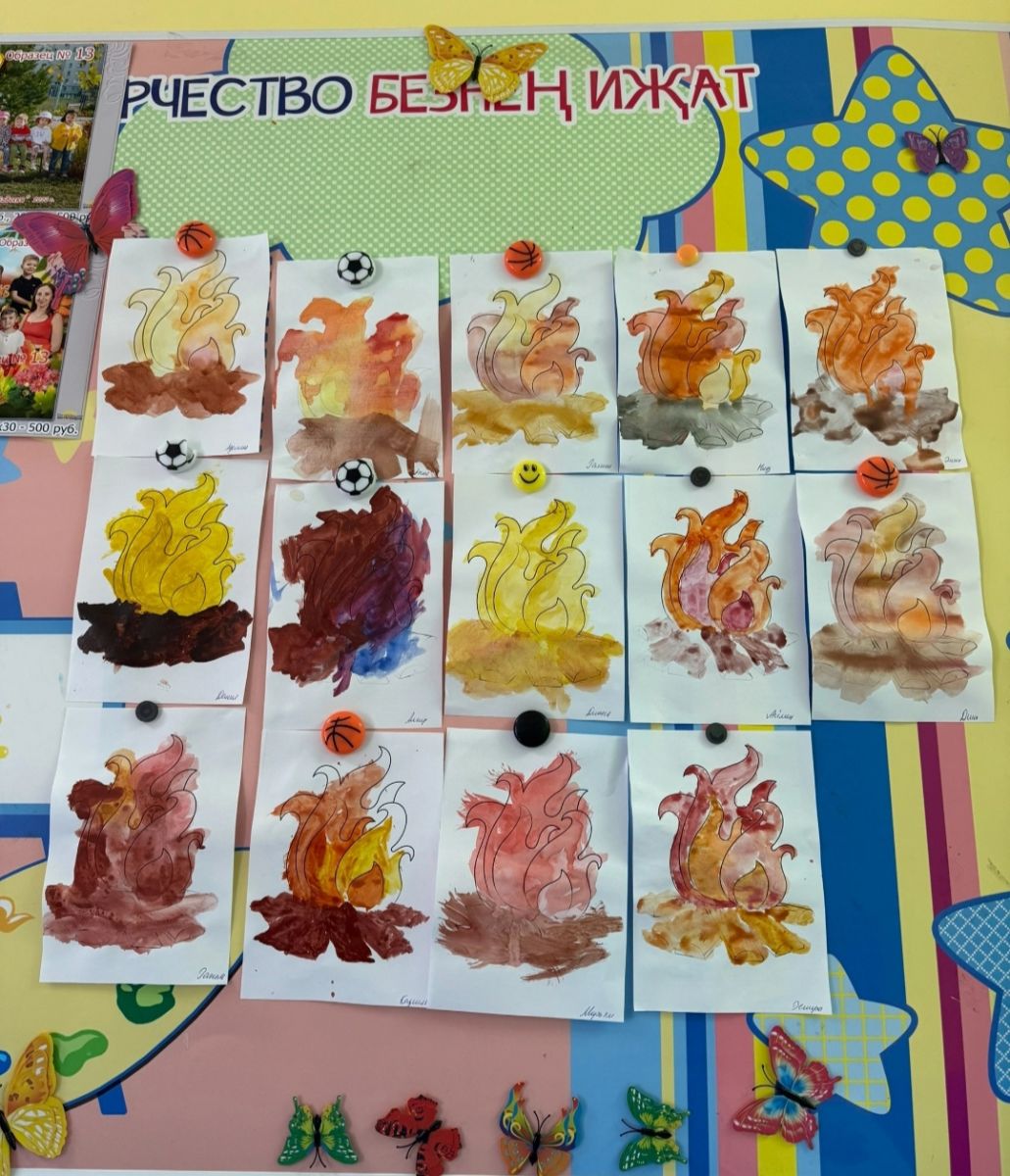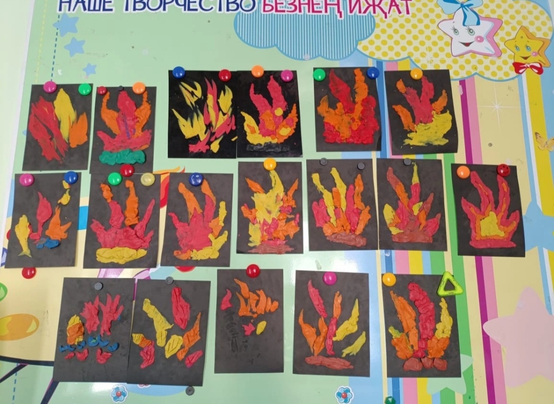 Воспитатель Анастасия Дмитриевна очень часто использует эту нетрадиционную технику работы. Вот и сегодня ребятам была предложена тема «Огонь- друг, огонь- враг», представления о пожарной безопасности в природе, об опасности разжигания костров для окружающей среды и собственного здоровья. Дети познакомились с правилами безопасности в лесу, закрепили приёмы лепки в технике «пластилинография», во время занятия проявили творчество и инициативу.