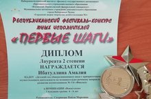 Диплом II степени! На днях состоялось награждение победителей Республиканского фестиваль-конкурса юных исполнителей "Первые шаги". Ибатуллина Амалия с шуточной песней "Молочный зуб" снова порадовала нас победой! Умничка!