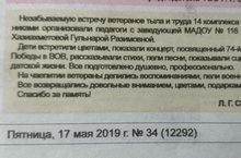 Сегодня вышел новый номер газеты "Челнинские известия", в которой ветераны, труженики тыла выразили свою благодарность в адрес педагогов и заведующей Хазиахметовой Гульнары Разимовны МАДОУ N116 "Фиалка" за незабываемую встречу в честь празднования 74-й годовщины Победы в Великой Отечественной войне.