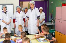 Команда проверяющих прошлись и по группам, посмотрели процесс получения пищи младшими воспитателями, раздачу, а так же накрывание и сервировку стола с участием «дежурных по кухне» детей – трогательных малышей в красивых фартучках и колпаках.