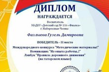 Поздравляем воспитателя Фазлыеву Гузель Дамировну за победу в Международном конкурсе "Методические материалы". Она награждена дипломом 2 степени за лепбук "Правила дорожного движения" на татарском языке. Молодец!!!