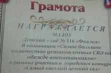 Сегодня детский сад Фиалка был торжественно награждён грамотой в номинации "Самое большое количество установленных СВЭ на одежде воспитанников" в рамках городского конкурса "Самый светлый детский сад".