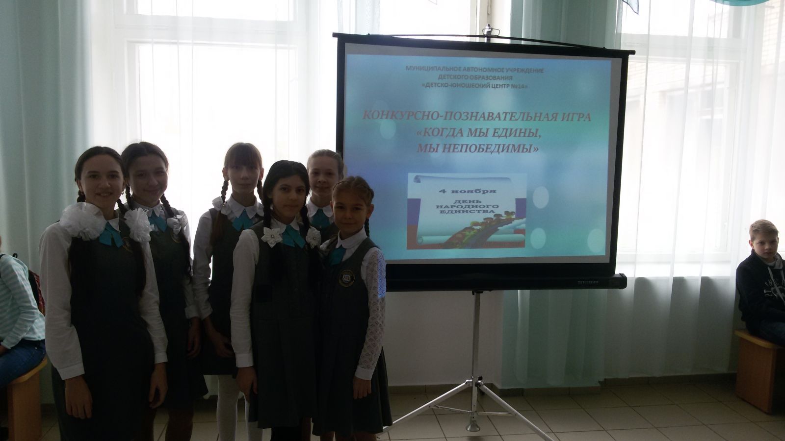 1 ноября в МАУ ДО «Детско-юношеском центре № 14» прошла конкурсно – познавательная игра «Когда мы едины, мы непобедимы!». Участниками были отряды городских программ «Зебра» и «Союз наследников Татарстана» образовательных организаций среди 6-7 классов. Командам нужно было знать: символику РФ и РТ; популярные русские и татарские пословицы;