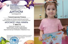 Поздравляем воспитанников 3 группы - Абдулхаева Даниса и Гималетдинову Ралину - с победой во всероссийском детском творческом конкурсе ко Дню космонавтики "Космос над нами".