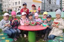 Мало кто знает, но у любителей сочной полосатой ягоды есть свой праздник - всемирный день арбуза. История этого праздника идет родом из США, где данный праздник имеет статус национального. Арбуз является не только вкусным лакомством, но и полезным. Из него можно приготовить множество блюд. Как же празднуют день арбуза? Конечно же, собираются дружной компанией за столом дома либо на природе, съедают огромное количество арбузов, а затем устраивают соревнования – кто выложит самое длинное слово арбузным семечком, или объявляют конкурс на лучшую фигуру, вырезанную из арбуза. Мы с ребятами тоже решили присоединиться к празднованию и изготовили яркие и красочные поделки.
