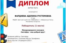 Хорошие знания ПДД обеспечивают безопасное передвижение детей и взрослых на дороге и во дворах. Мы верим, что дети могут быть настоящими экспертами в этой области и, что их мнение может быть полезным для всех участников дорожного движения. Для того, чтобы закрепить знания ПДД существуют различные конкурсы для детей. В одном из таких приняла участие Фардиева Аделина - воспитанница 7 группы. Аделина - победитель Международного конкурса «Светофор - наш добрый друг!». Поздравляем Аделину и её творческого руководителя - воспитателя Айгуль Занифовну - с успешным участием в конкурсе. Желаем новых успехов и достижений! -