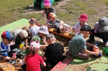 Дети 2 группы с увлечением проводят время в песочнице - строят замки, лепят куличики. -