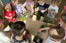Травянчик - это забавное существо, изготовленное из опилок, капронового чулка и семян травы. За травянчиком нужно ухаживать - поливать его, тогда он будет расти, вернее, расти будет его "прическа", которая со временем станет густой шевелюрой и ее можно будет даже постригать. Это удивительно, но наблюдать за этим любят не только дети, но и взрослые. И никто не может пройти мимо, чтобы не улыбнуться и не потрепать травянчика по зеленой «шерстке». Особенно море удовольствия и радости травянчик приносит детям. Вырастив своих забавных экоигрушек, ребята принимаются делать причёски своим зелёным питомцам. Этим и занялись ребята 10 группы с воспитателем Натальей Сергеевной.