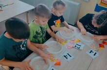 В подготовительной группе ребята знакомятся с числами не только традиционными способами. На очередном занятии ребята 3 группы учились писать цифры, используя песок. При этом делали это ребята, задействовав обе руки, что способствует успешной работе обоих полушарий головного мозга.