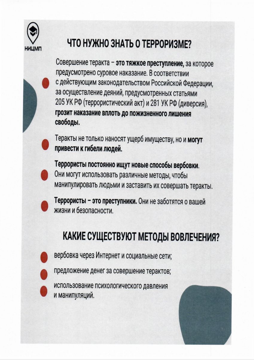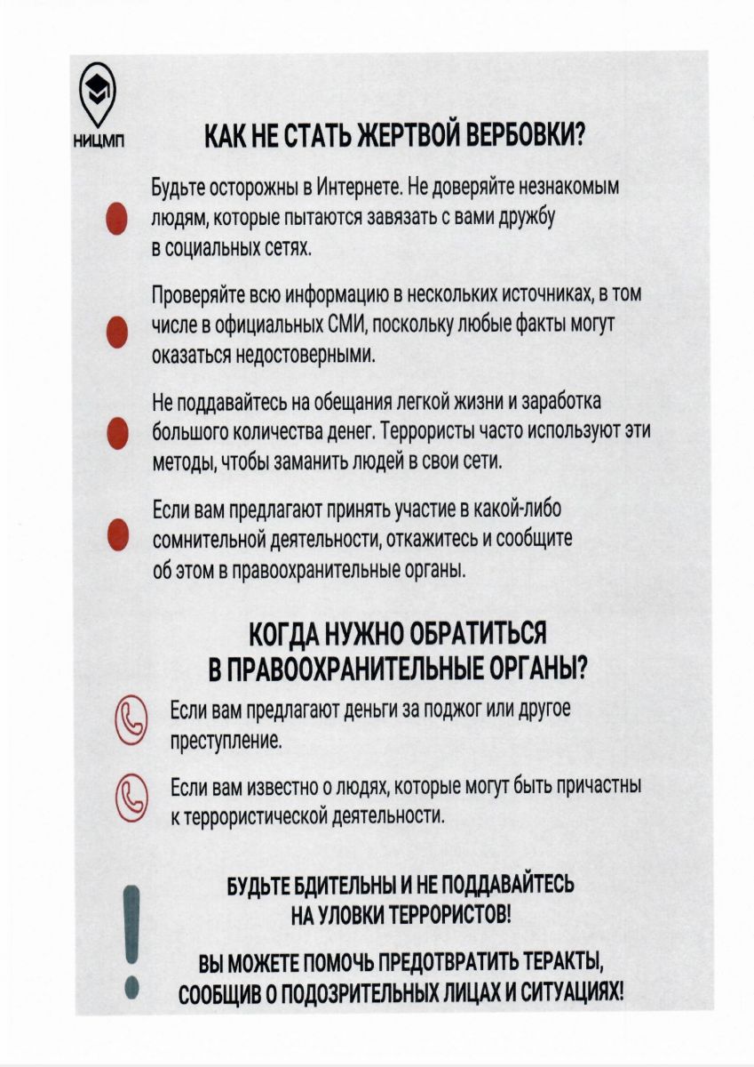 Опубликовано: 27.03.2024Для повышения осведомленности граждан о ключевых правилах безопасного поведения в случаях террористических угроз специалисты НИЦ Мониторинга и профилактики разработали информационные карточки с пошаговыми алгоритмами и четкими инструкциями о том: