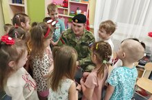 1 декабря, мы с детьми пригласили на целевое занятие по нравственно-патриотическому воспитанию старшего брата воспитанника 17 группы, который три дня назад демобилизовался из рядов Российской армии, отдал долг Родине, получил солдатскую закалку. На этой встрече ребята узнали о солдатских буднях, строевой подготовки, форме, боевом братстве, отваге. Атмосфера встречи была тёплой и добросердечной. Ребят покорила открытость и доброжелательность парня. Они узнали от него много интересного. С восхищением смотрели на солдата, внимательно слушали, а потом посыпались вопросы. Он подробно ответил на все вопросы. Дети обо всём хотели знать: чем занимаются солдаты, за сколько минут они должны одеться и заправить кровать, чем в армии кормят и дают ли сладкое, сколько часов солдат спит, служат ли девочки в армии, как называется головной убор, обувь, что означают значки на груди, и т. д.