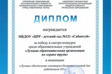 Диплом за победу в смотре-конкурсе среди образовательных учреждений "Лучшая образовательная организация по охране труда" в номинации "Лучшее обеспечение санитарно-бытовых условий для работников ОУ".