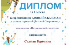Поздравляем с победой в соревнованиях "Ловкий скалолаз" в рамках Детской Спартакиады воспитанников Веронику С. за 1 место и Амира Х. за 2 место в номинации "Начинающий скалолаз".