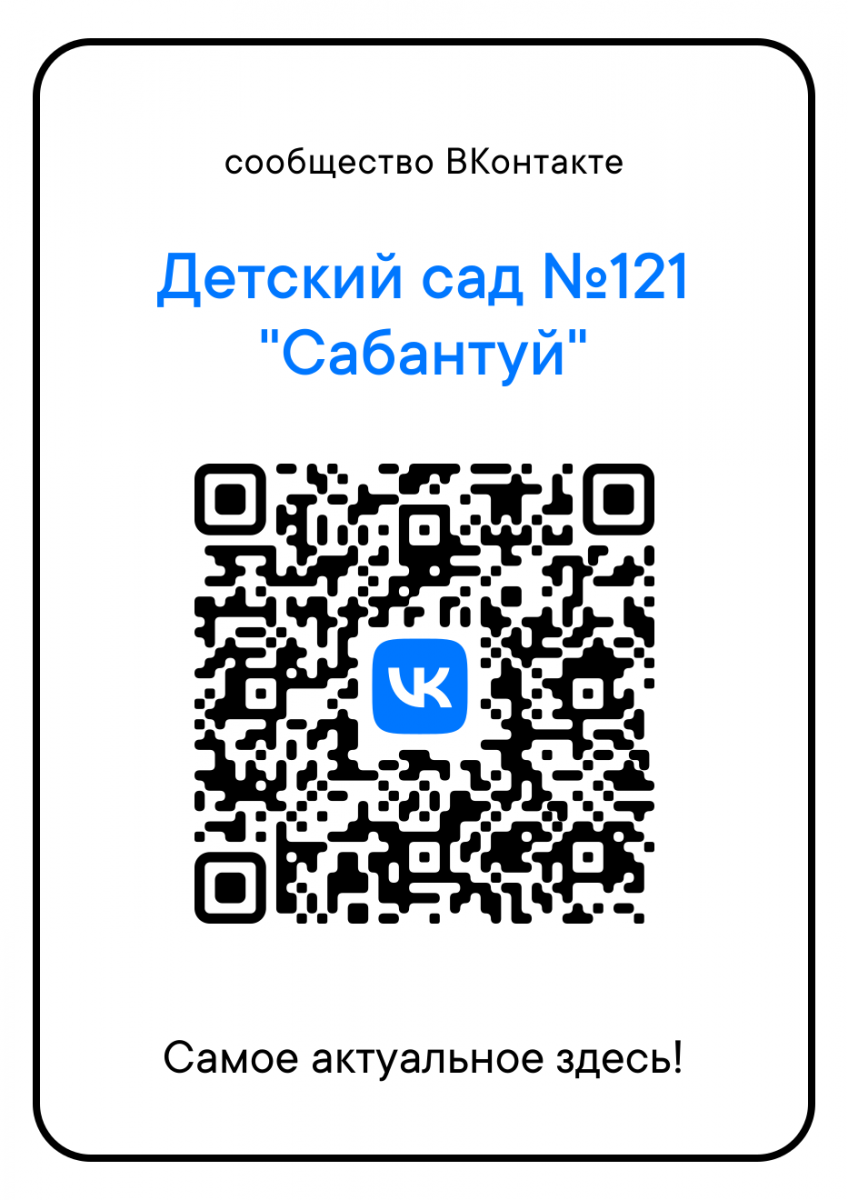 Уважаемые родители и гости! Подписывайтесь на группу МБДОУ "Детский сад №121 "Сабантуй" в социальной сети в Контакте и будьте в курсе всех интересных новостей и событий! https://vk.com/public205853599